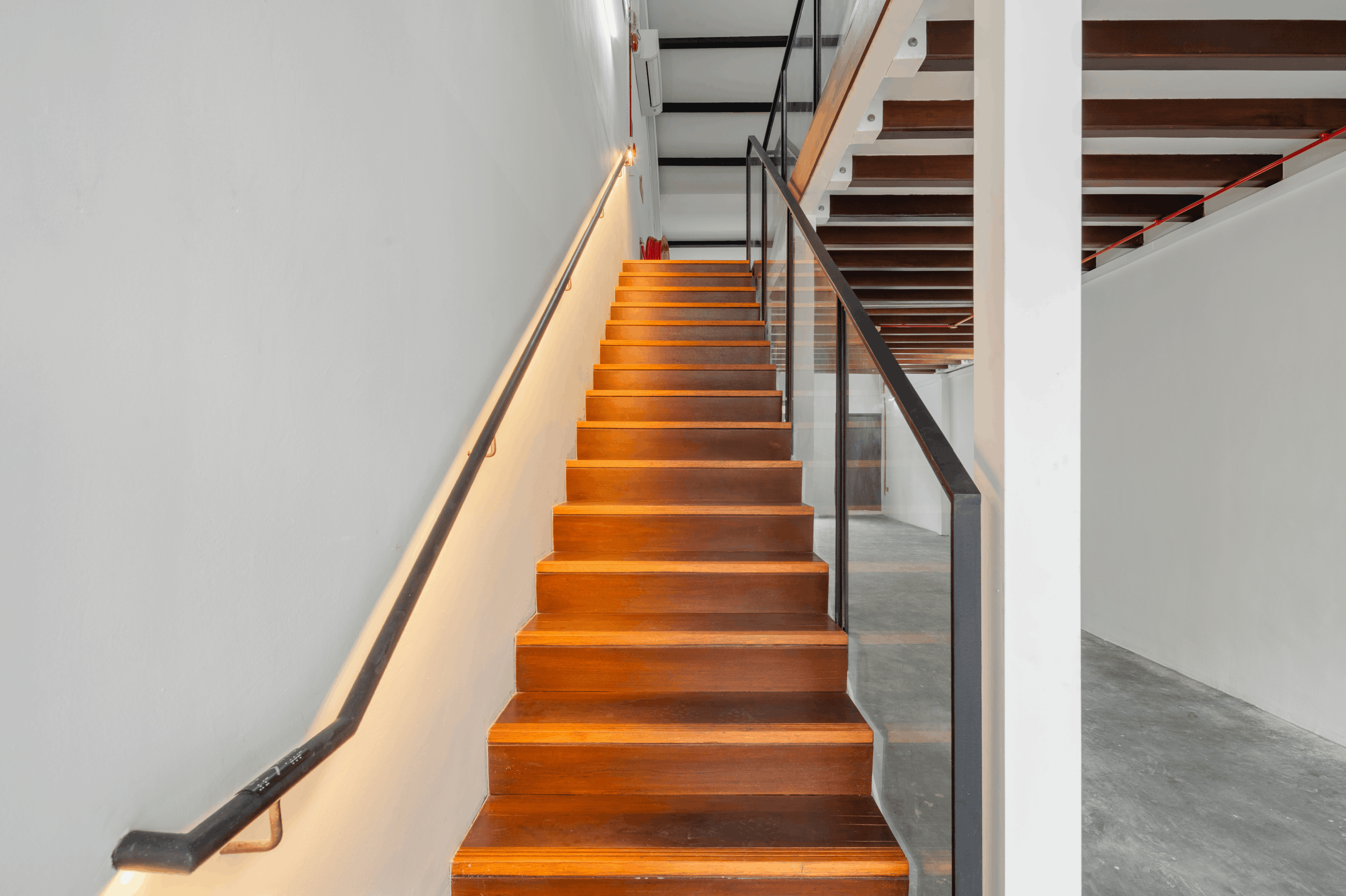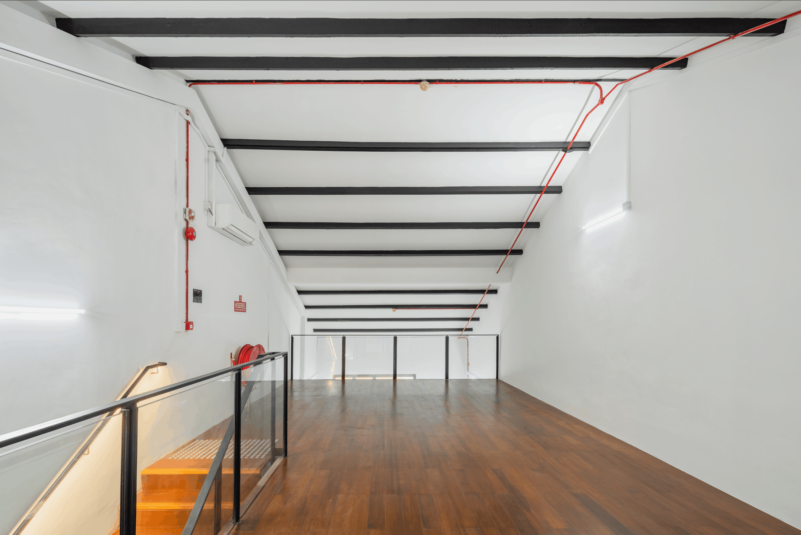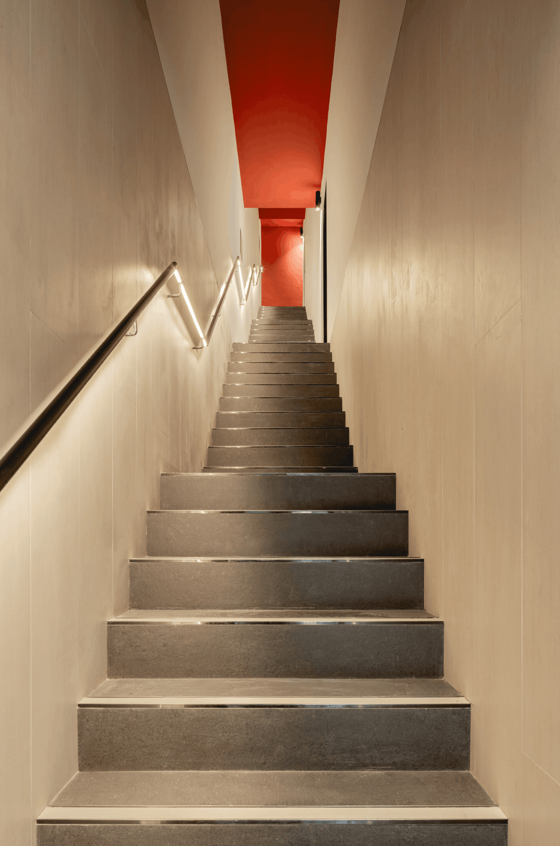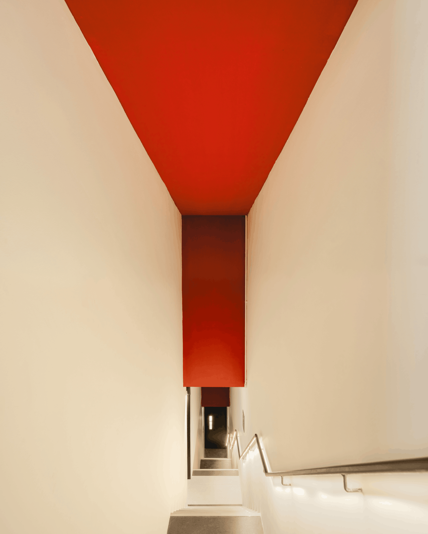 Contrasting colours of grey, white and red are used to bring out the architectural elements
